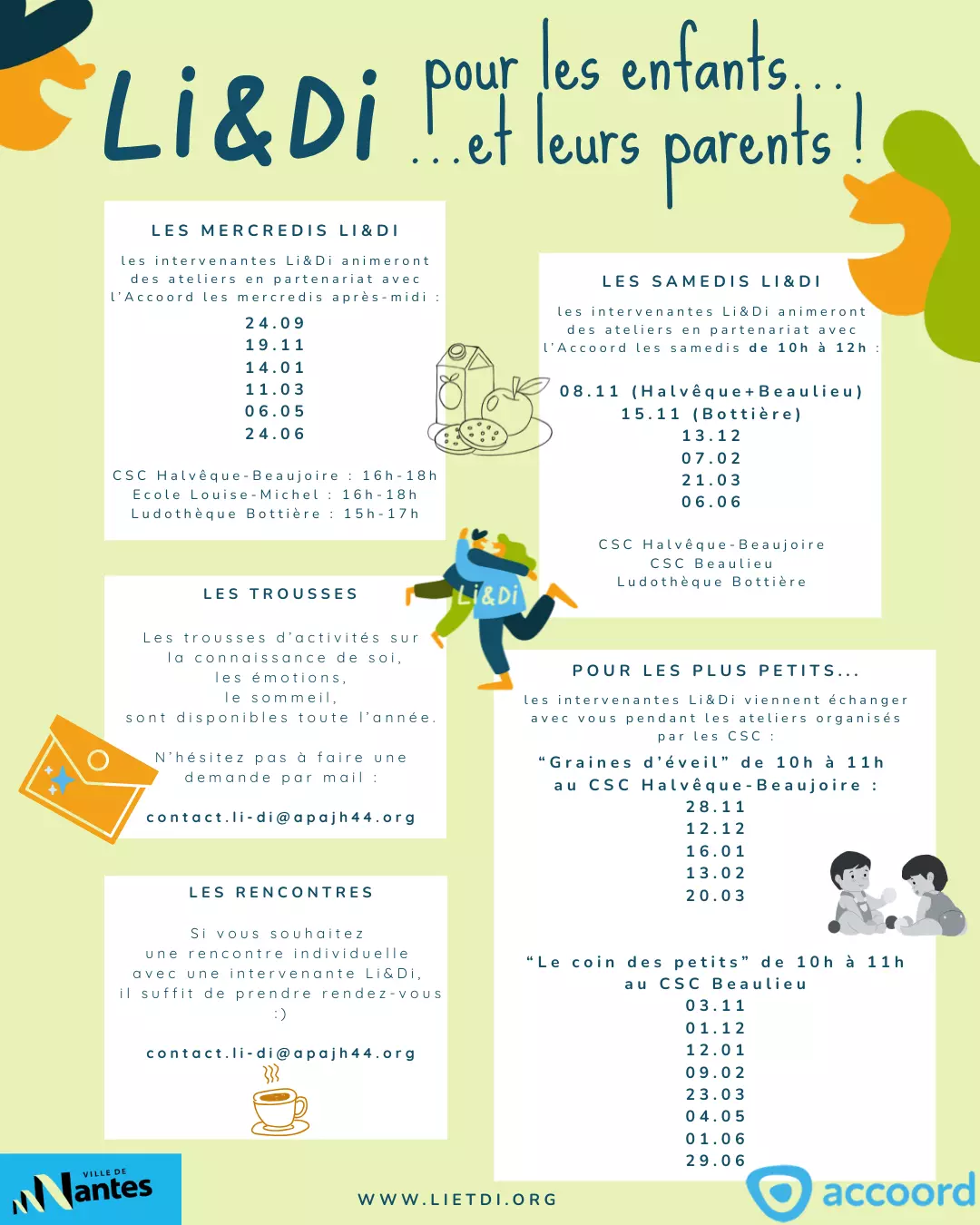 Beaulieu – Halvêque – BottièreA travers les mercredis Li&Di, les samedis Li&Di et les ateliers pour les plus petits, les intervenantes Li&Di viennent à votre rencontre dans les maisons de quartier pour échanger, partager, et passer du bon temps ensemble !